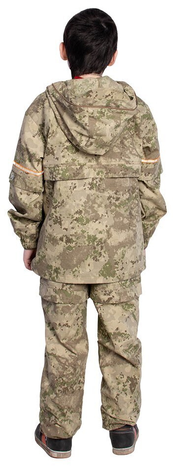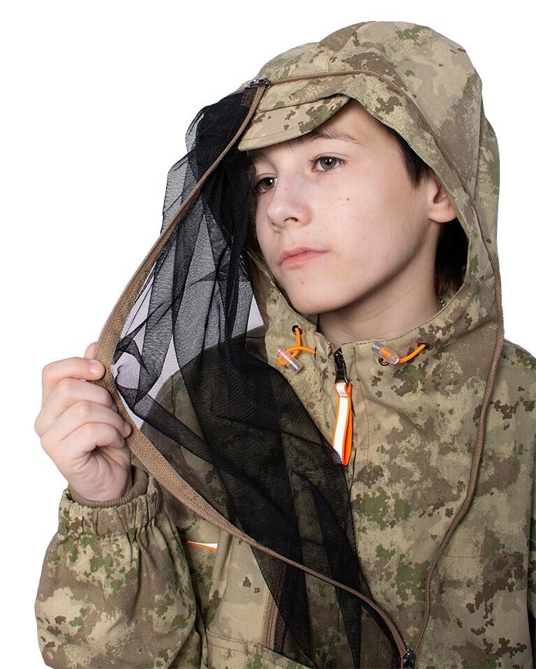 - Капюшон куртки – с козырьком, регулируется по объему эластичным шнуром и хлястиком, дополнен антимоскитной сеткой на молнии, которая быстро застегивается в случае необходимости и также легко убирается;