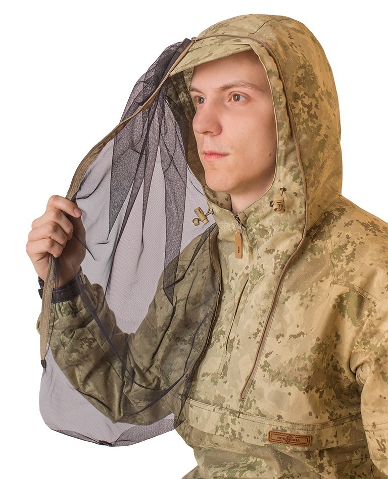 - Противомоскитная сетка обеспечивает защиту лица и шеи от насекомых. Пояс и низ брюк, низ куртки и рукавов собраны эластичной резинкой.