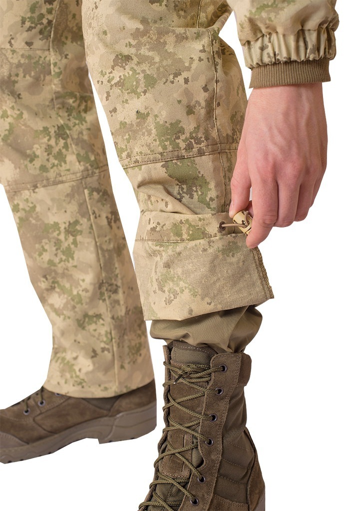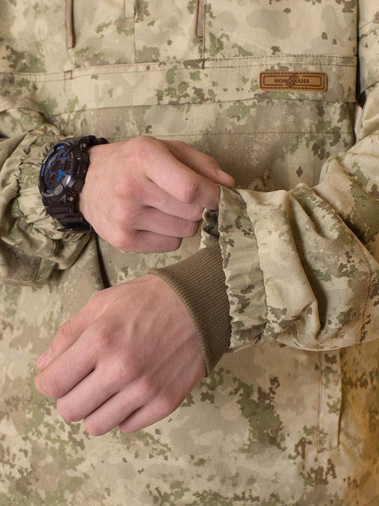 - Пыльники с плотной трикотажной манжетой на рукавах и брюках. Усилительные накладки в области коленей. Дополнительная регулировка низа куртки, пояса брюк и лицевого выреза капюшона шнуром.