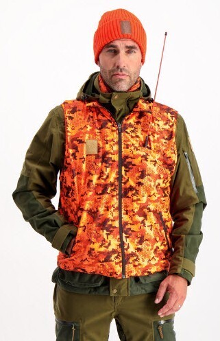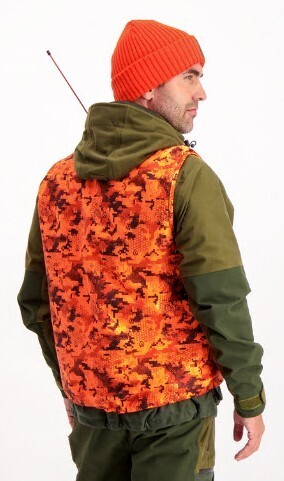 Охотничий жилет с новым защитным оранжевым камуфляжным рисунком. Справа карман для радио с кнопкой и держателем антенны.